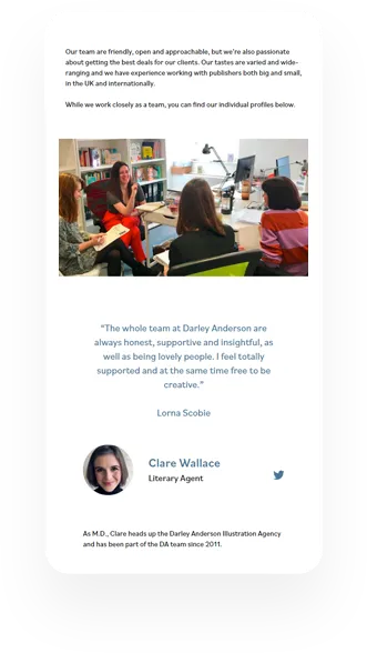 The Darley Anderson Agency have several sites representing the different areas of their industry. With strong brand guidelines it was important that our new website utilised these throughout, to ensure brand consistency across the sites.