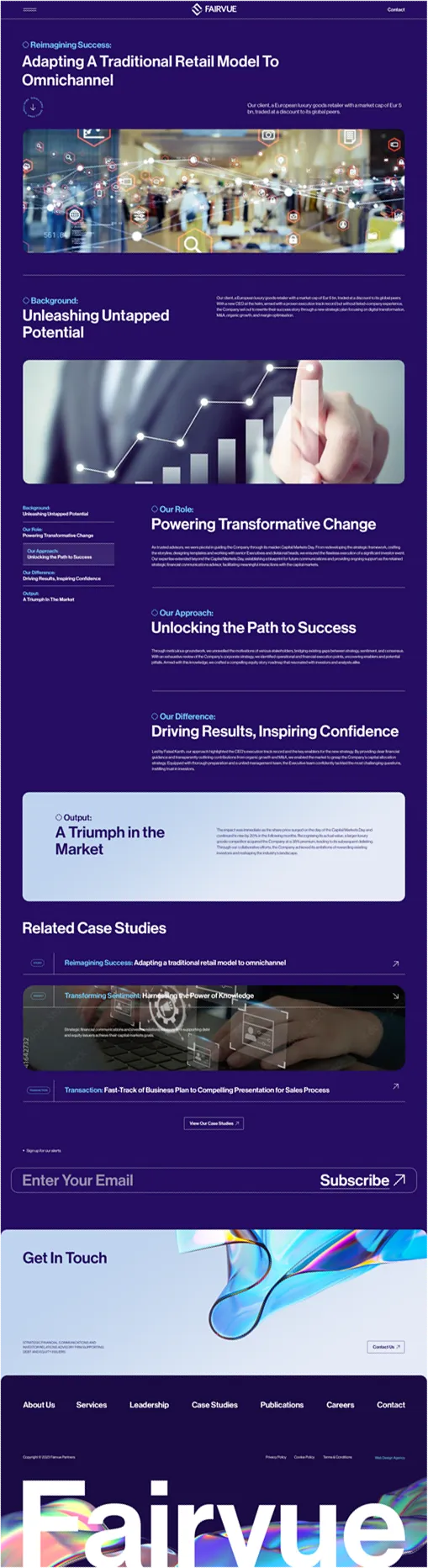 As Fairvue Partners approached their 10th anniversary, they recognised the need to elevate their online presence. Historically, the company had not focused heavily on its digital footprint, but after experiencing significant growth in the industry, they sought a new website that would position them as a leader in their field and make a bold statement, setting them apart from the competition.