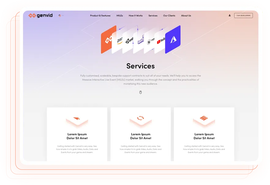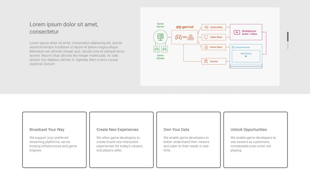 The gaming industry is constantly moving forward; the Genvid website was not. The super intelligent Genvid SDK allows the production of ultra-modern, viewer-interactive gaming experiences, so the website needed a bit of flair to reflect this while also retaining a clean UX.