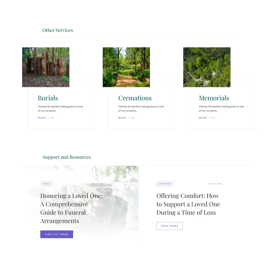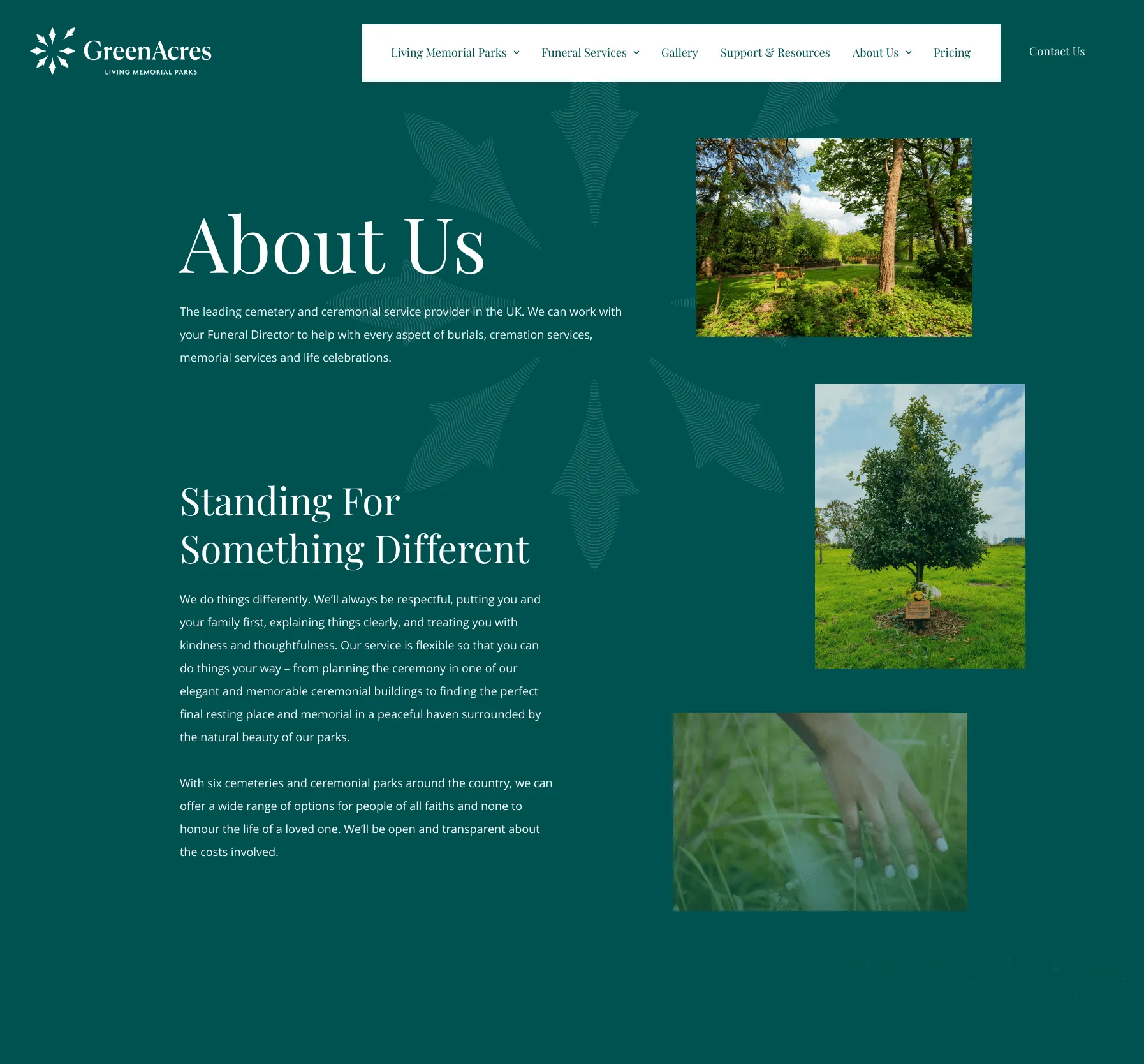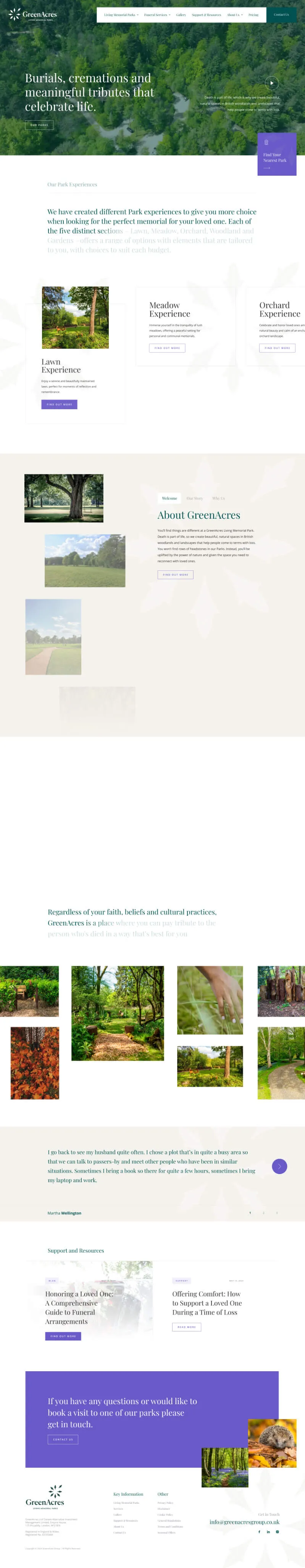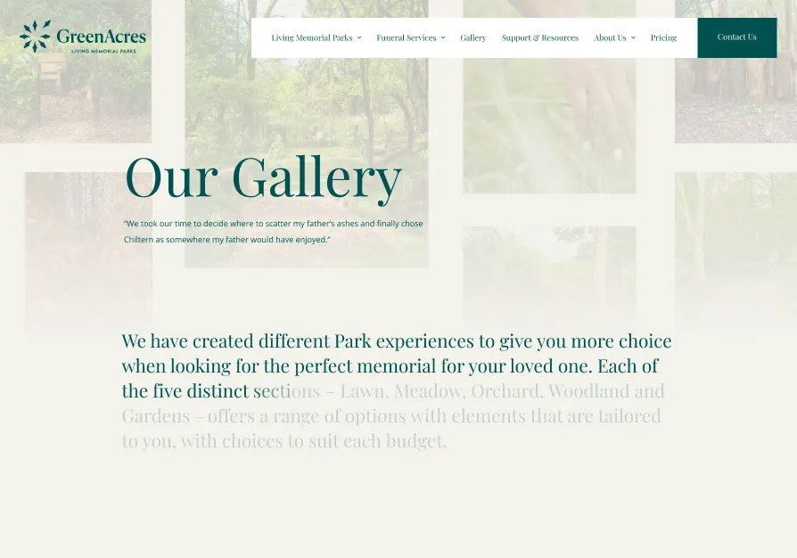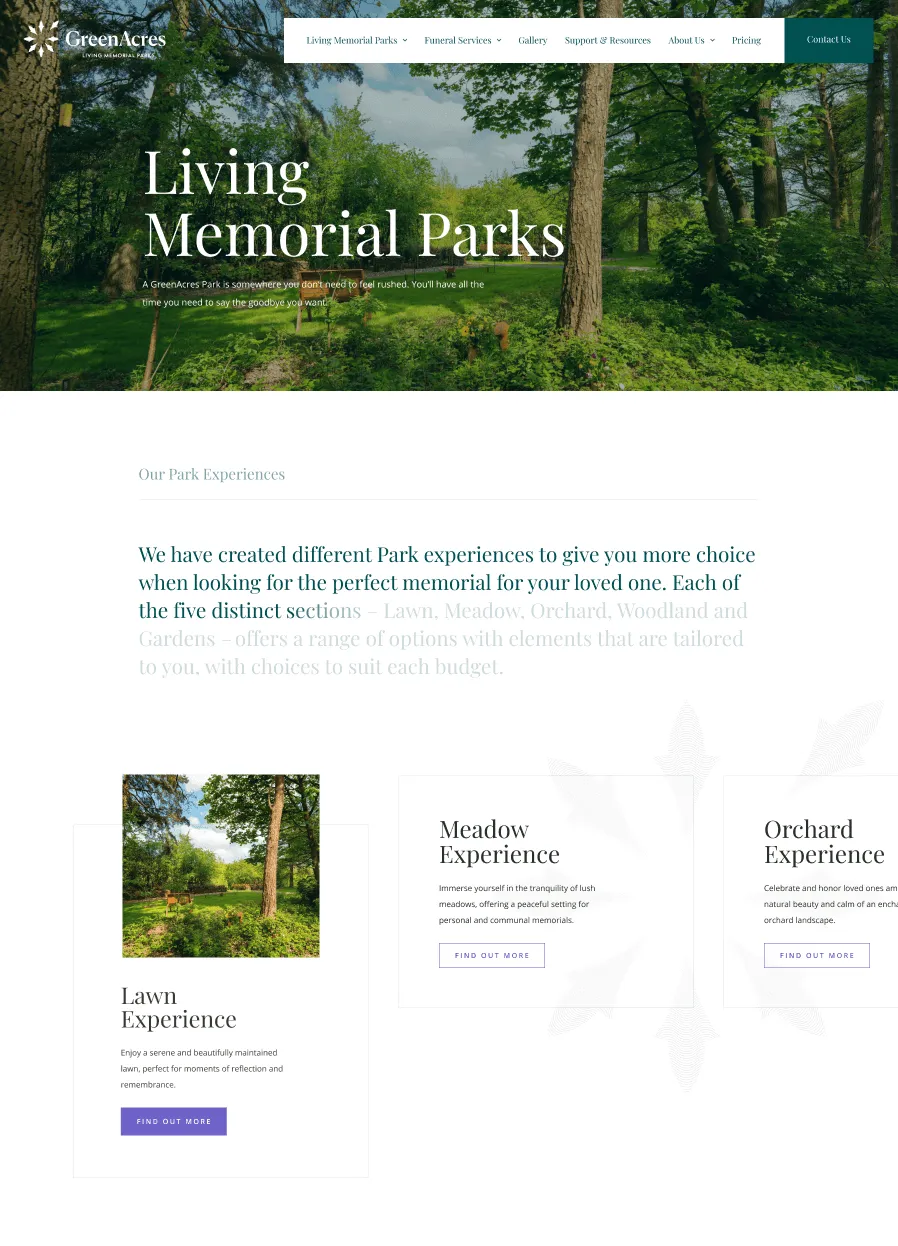GreenAcres Group is the leading provider of natural burial and ceremonial services in the UK. We partnered with them in order to redesign and redevelop their website. The goal was to create a site design that effectively reflects the company’s ethos of compassion and sustainability while improving usability and accessibility.