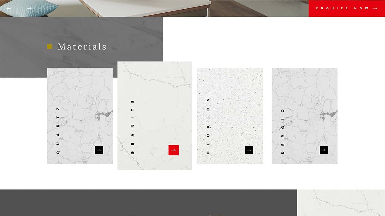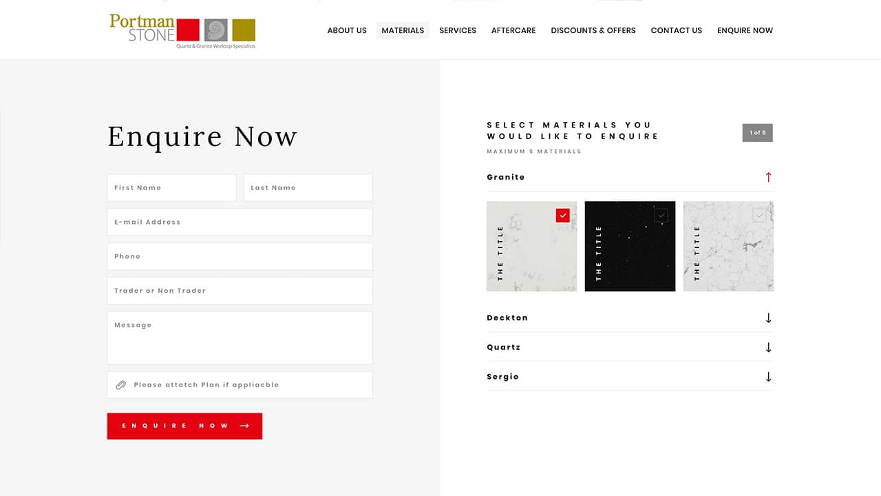 As part of the development we created a bespoke sample selector form; this allows users to select from a range of materials displayed alongside their matching visuals. This enables users to see examples of each stone surface whilst allowing the client to provide more customised quotations for potential customers.